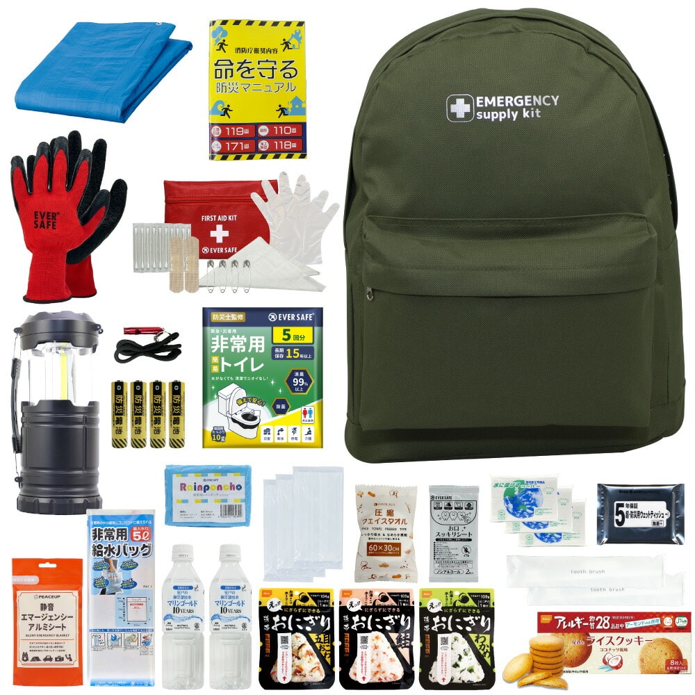 防災セット 1人用 20L エマージェンシーリュック グリーン おしゃれ 非常用持ち出し袋 防災士監修 防災リュック 非常食 保存水 懐中電灯 簡易トイレ アルミシート 救急セット 警戒レベル3 軽量 コンパクト PEACEUP L3EM01