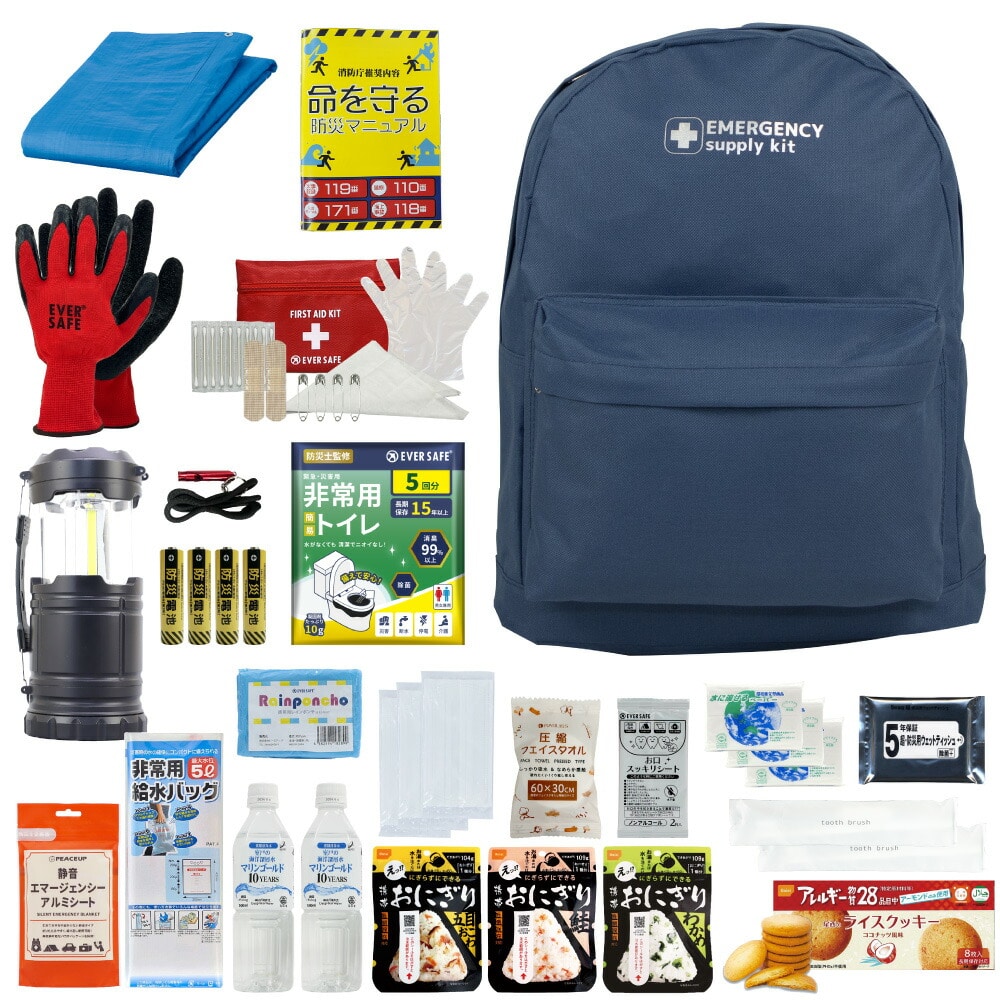 防災セット 1人用 20L エマージェンシーリュック ネイビー おしゃれ 非常用持ち出し袋 防災士監修 防災リュック 非常食 保存水 懐中電灯 簡易トイレ アルミシート 救急セット 警戒レベル3 軽量 コンパクト PEACEUP L3EM01