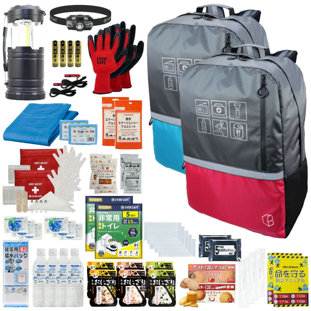 防災セット 2人用 40Lビッグリュック ブルー×レッド 防災士監修 防災グッズ 大容量 非常食 お菓子 保存水 ランタン 非常用トイレ 救急セット 懐中電灯 衛生用品 地震対策 警戒レベル3 PEACEUP L3BR02