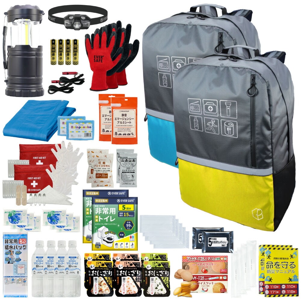 防災セット 2人用 40Lビッグリュック ブルー×イエロー 防災士監修 防災グッズ 大容量 非常食 お菓子 保存水 ランタン 非常用トイレ 救急セット 懐中電灯 衛生用品 地震対策 警戒レベル3 PEACEUP L3BR02