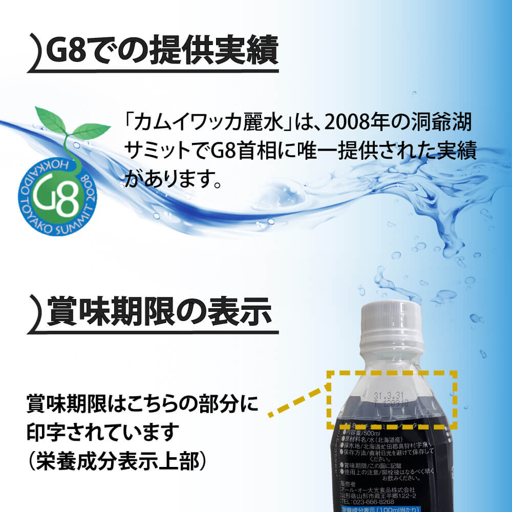カムイワッカ麗水 10年保存 ●カムイワッカ 麗水とは ・洞爺湖サミット首脳晩餐会(2008年7月)で使用されたお水なので、その安全性は立証済です。 ・北海道虻田郡真狩村の羊蹄山麓から湧き出す自然水。 ・空気に触れさせずに加熱殺菌。(ボトルぎりぎりまで水が詰まっています) ・賞味期限10年の長期保存水! 湧水(天然の湧き水)時点での無菌状態と、 特殊な充填方法により保存水として、現在確認できている保存可能年月が最大15年です。 平成12年度の製造水を現在まで、公的機関にての水質分析にかけ飲料水適合基準を満たしております。 類似他社の商品は、経過年数の確認も無く、公的機関での水質分析も無いまま、 保存水として販売している会社が少なくありません。 お客様に置かれましては、くれぐれも類似商品に ご注意下さい。 ●入数 500ml×48本 ●保存方法 直射日光、高温多湿を避け涼しいところで保存して下さい。 ※商品のパッケージデザインは予告なく変更する場合があります。 ※梱包方法について 当店はエコ包装を努めておりますので、簡易包装にてお届けしております。 2ケースご注文の場合は、2ケースをPPバンドで1つにまとめた状態で発送いたします。