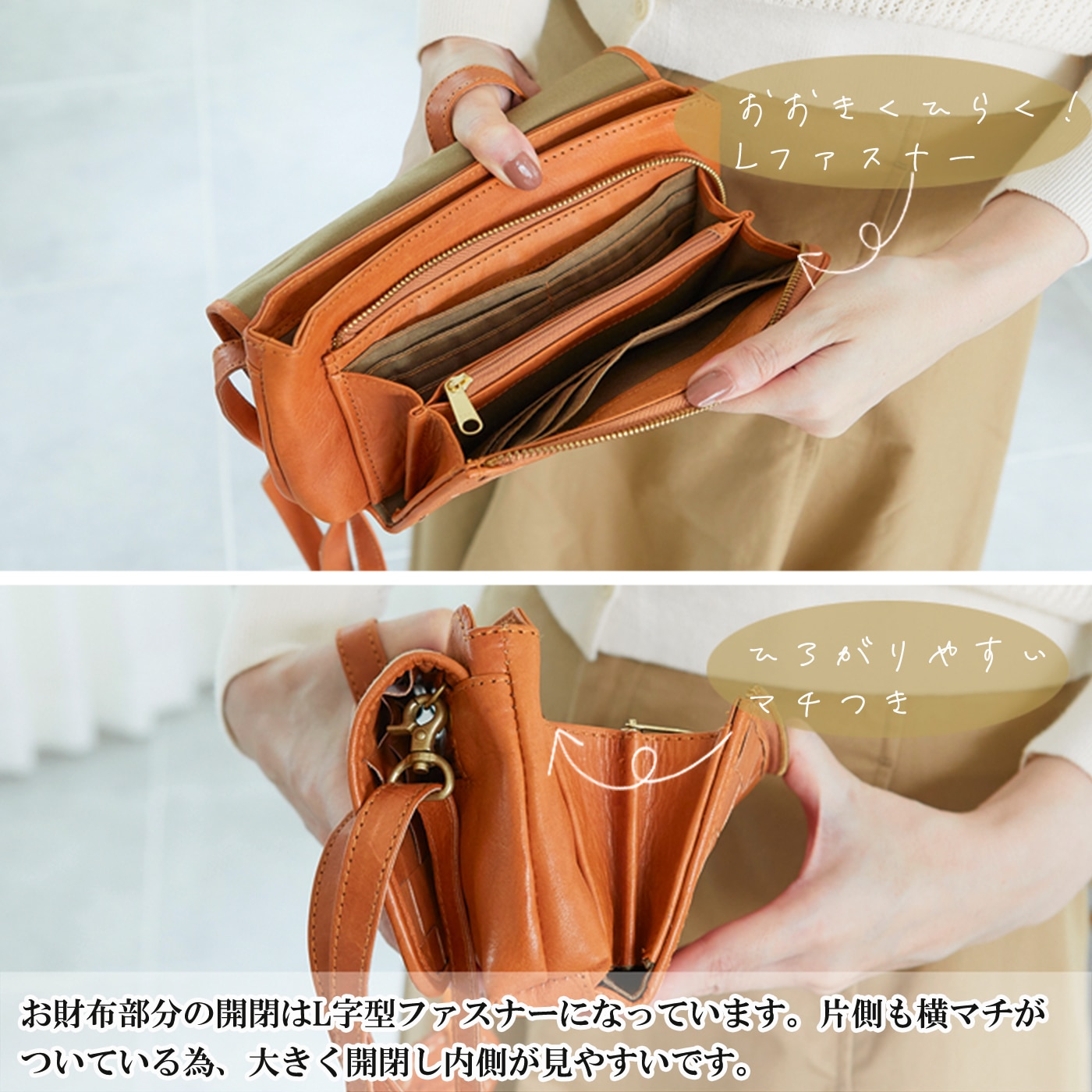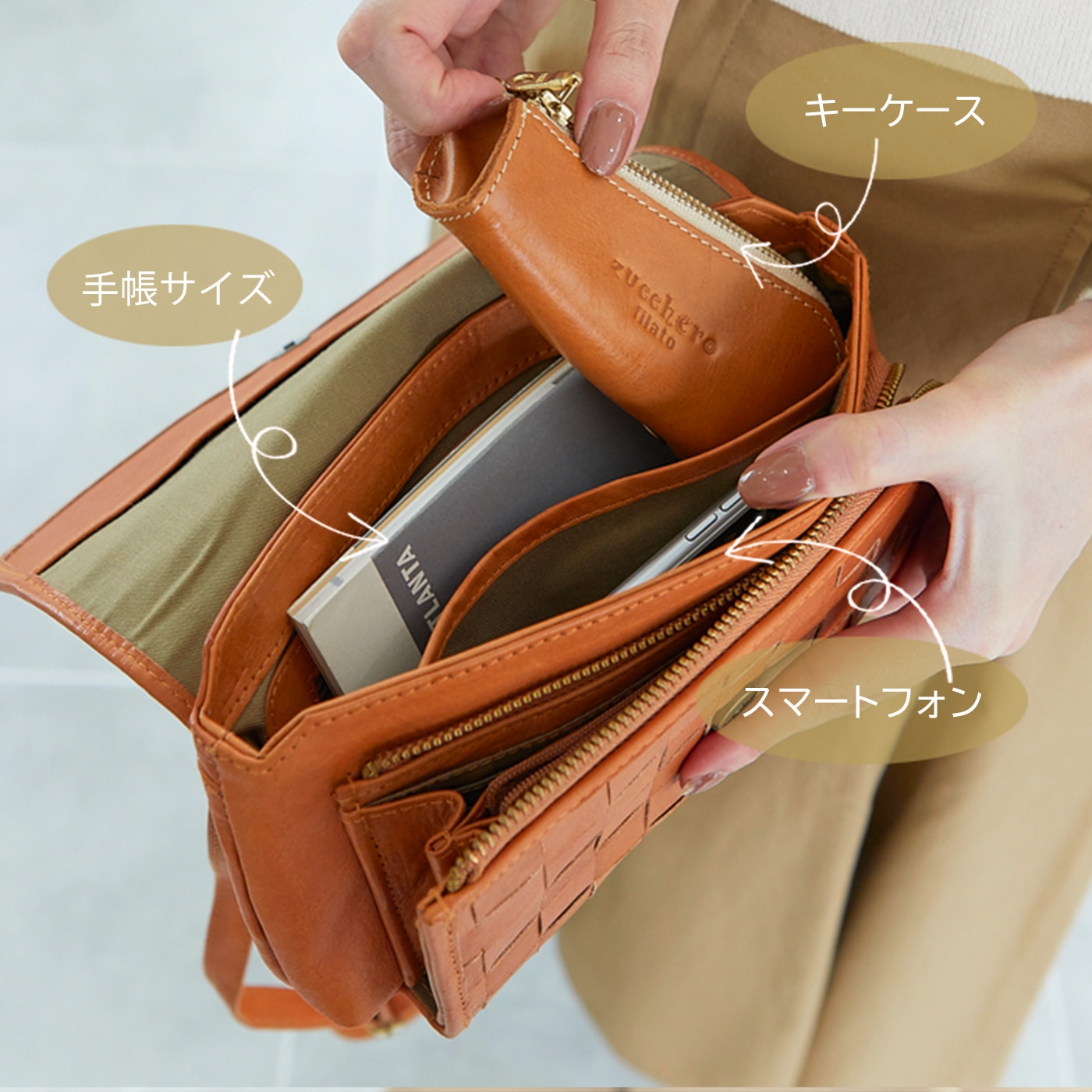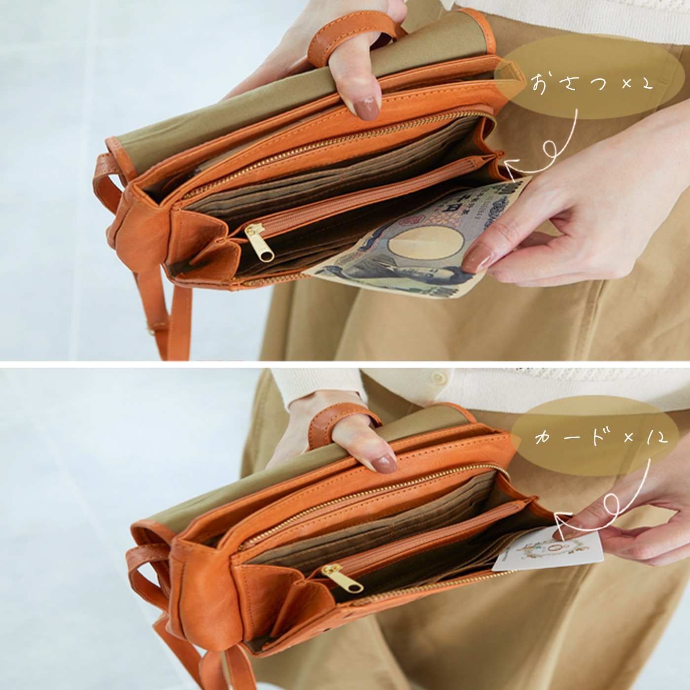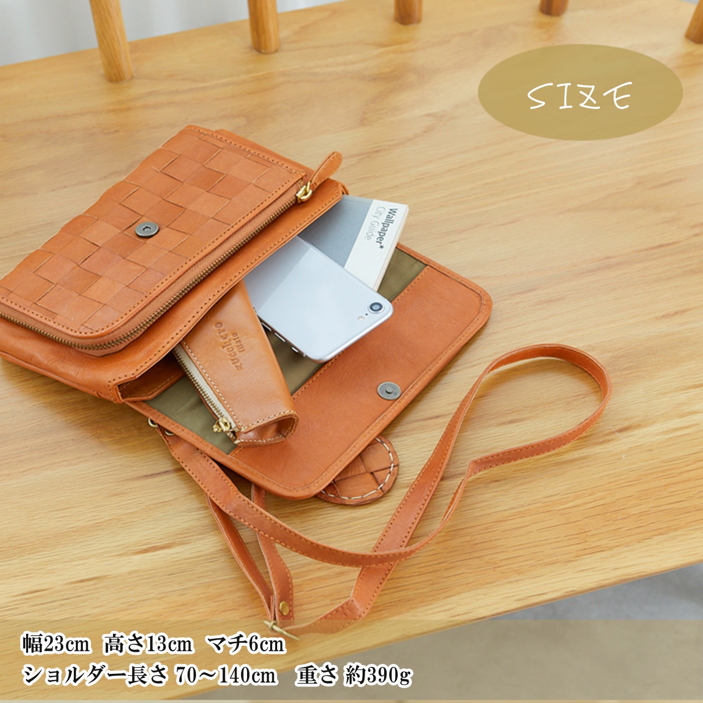 素材 牛革 サイズ・容量 幅:23cm 高さ:13cm マチ:6cm ショルダー長さ:70-140cm 内側:カード入れ×12 お札入れ×2 小銭入れ×1 重さ:約390g カラー ブラウン 生産国 インドネシア 特徴 おすすめ! おしゃれなズッケロの人気定番シリーズ 売れ筋!雑誌 リンネル掲載シリーズ♪ 職人の手により、1枚ずつ手で 染めては天日で乾かすなどの工程を 何度も繰り返して 仕上げたズッケロオリジナルの カウレザーを使用しています。 ひと目で本革とわかるナチュラルな風合い 素朴な匂いや革本来の色の濃淡が 使い込む程に味わい深く変化し、持つ人に 馴染んくる為愛着の湧くオリジナル バッグになります。 くったり柔らかく、表情豊かになる本牛革 ならではの、経年変化をお楽しみ下さい。 長財布・小銭入れ等ちょっとした 小物類は収納できる、人気のお財布 ショルダーバッグです。 またショルダーベルトを取り外す事で クラッチバッグとしても使えます。 ベーシックなデザインは きれいめでもカジュアルでも お持ちいただけ 通勤・通学から普段使いまで幅広く お使いいただけます。 また誕生日や母の日等、記念日のプレゼントにも よく選ばれています。