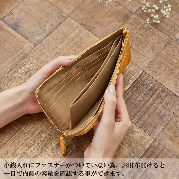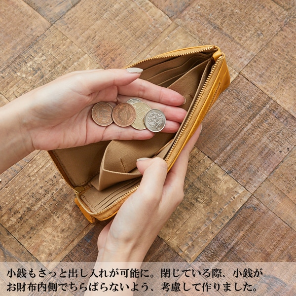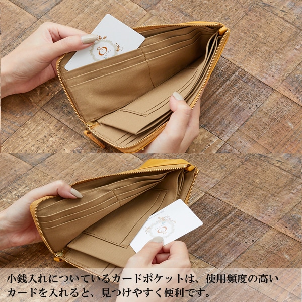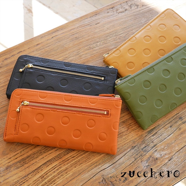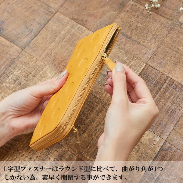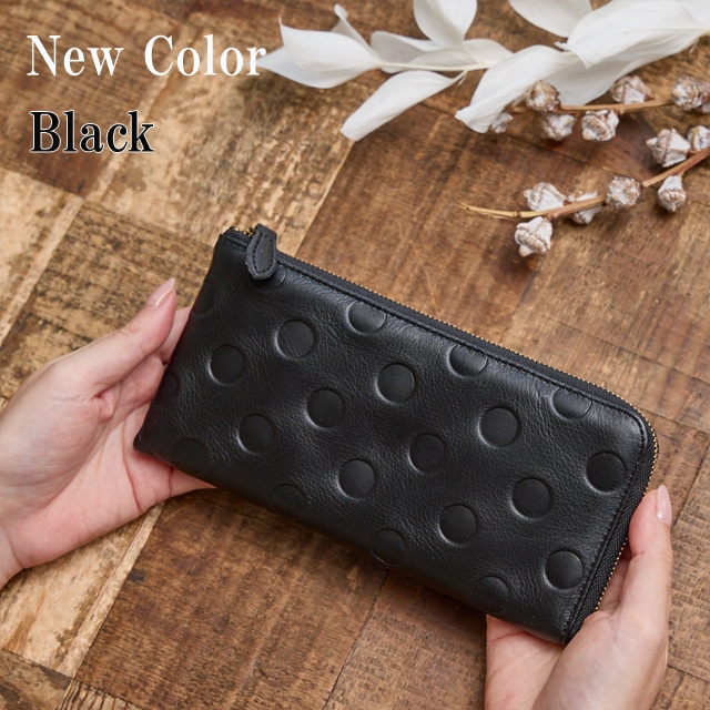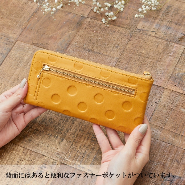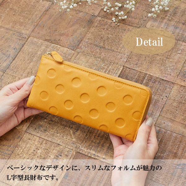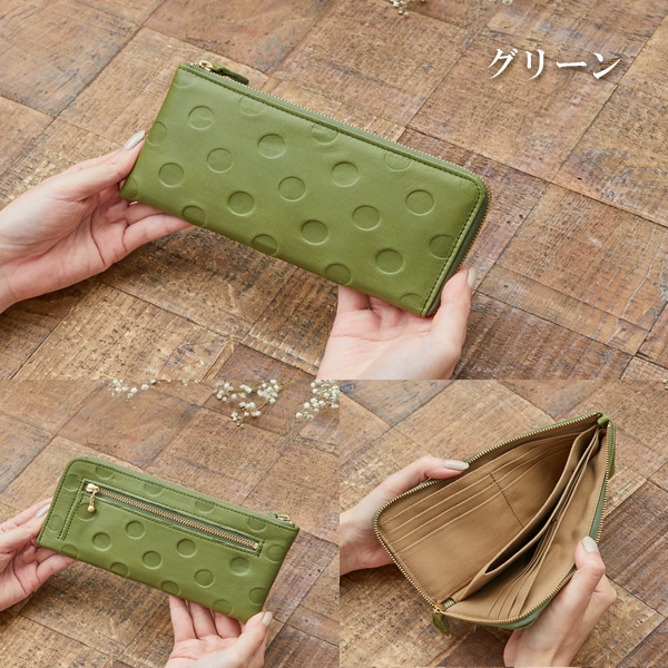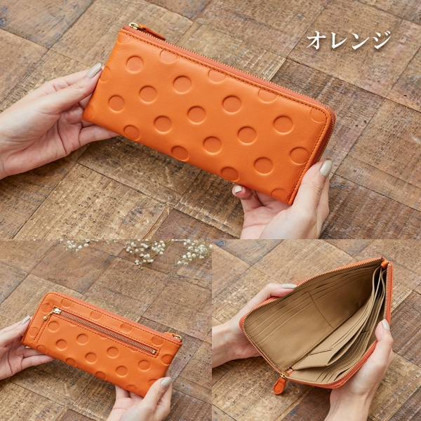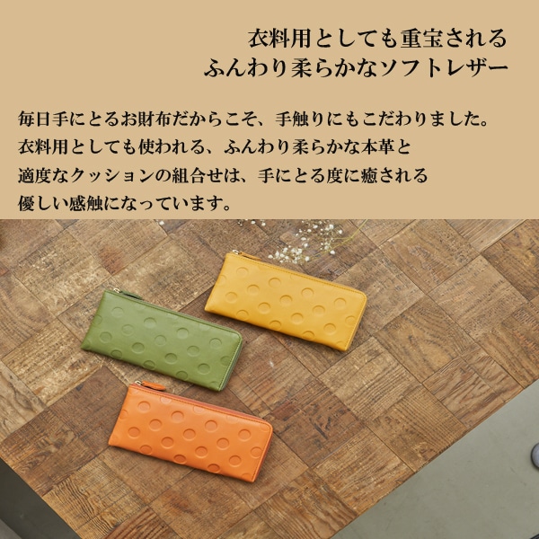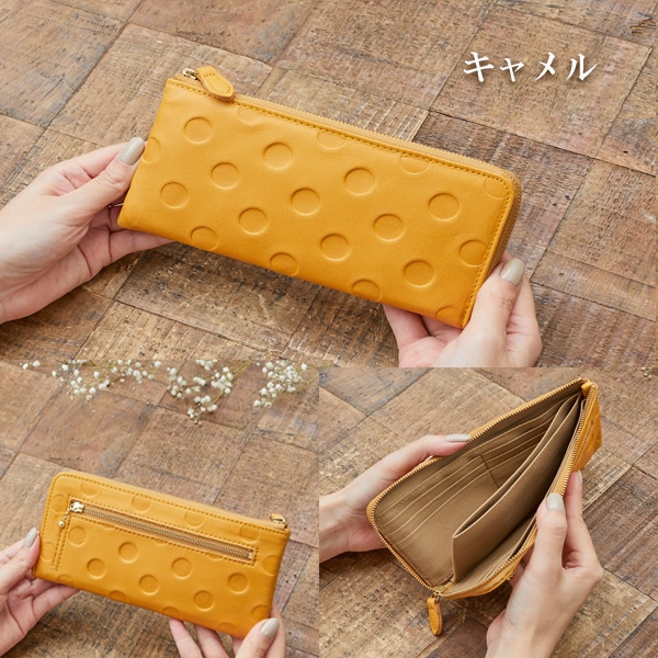 素材 牛革 サイズ・容量 幅:20cm 高さ:9cm マチ:1cm 内側:カード入れ×14 お札入れ×2 小銭入れ×1 オープンポケット×2 カラー ブラック オレンジ キャメル グリーン 生産国 日本 特徴 【お財布専門工場で作った日本製】 歴史あるお財布の専門工場で作った丁寧な作りが ロングセラーである人気のポイントです。 素材の調達から仕上げまで、とことん日本製に こだわったシリーズです。 その為、プレゼントにもよく選ばれています。 【手触りにこだわったお財布】 毎日手に取るお財布だからこそ、癒される 手触りにもこだわりました。 衣料用の革としても長年重宝されている ふんわり柔らかな牛革に、可愛らしい水玉を 型押しする事で、陰影がつき表情豊かな 雰囲気に仕上がりました。 【薄型のお財布をお探しの方におすすめ】 薄マチにこだわったスリムな長財布は 女性の手でも綺麗に収まり かさばる事がありません。 【背面にはファスナーポケット】 背面には便利なファスナーポケットがついています。 横マチがついている為、大きく開く事ができます。 こちらに小銭を入れても便利です。 【スリムながらもしっかり収納】 内側には、カード入れ×14 お札入れ×2 小銭入れ×1があり スリムなフォルムながらもしっかり収納できます。 片側が空いている為、お札も出し入れがしやすく スムーズに対応ができます。小銭入れにファスナーは ついていませんが、お財布の中で小銭が 飛び出さないよう高さを考慮して作られています。
