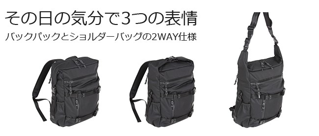 ドビー織機で織り上げた、他では表現できない生地目が特徴的なバックパックです。高い耐久性を誇りつつ柔らかみを感じさせる程よいボリューム感の生地、引 き締まった黒で統一されたデザイン、使う人のことを考えられた機能性と、どこをとっても隙のない逸品です。メインルーム内にはB4ファイルサイズ収納可能。リュックとショルダーの2WAY仕様で、さらに3つの形状変化を楽しめるバックパックです。