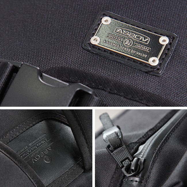 タテ・ヨコに350dの特殊ポリエステル糸を使用した、強度を誇るCORDURA 305d fabricを使用。ドビー織機で織り上げていますのでオックス、ツイル織りでは表現できない特徴的な生地目になっています。また、生地の裏面に通常より も2倍量のPU加工を施すことで、生地に程よいボリューム感を出しています。強度としなやかさが共存する、アッソブならではの生地です。