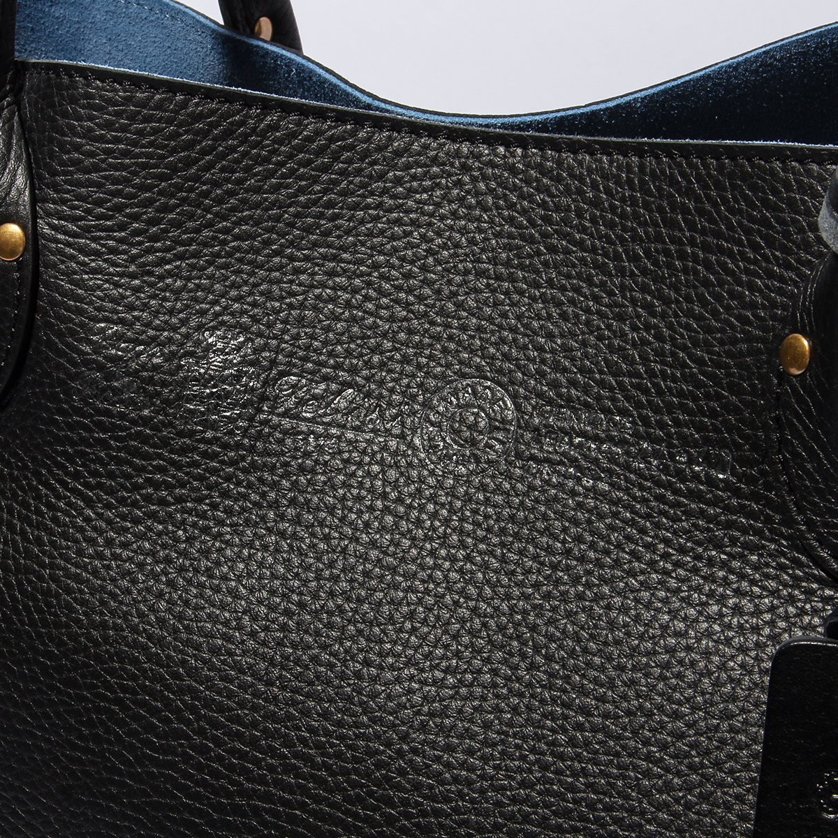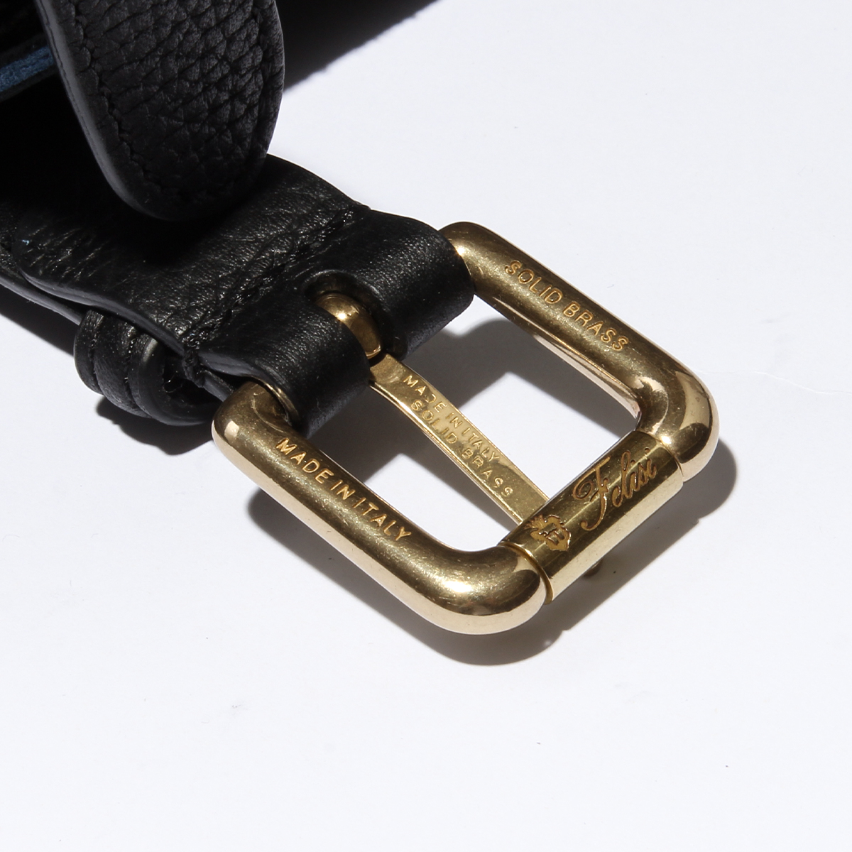 バッグ側面にはアジャスターベルトが付属。マチや開口部を調整できるだけでなく、クラシカルな風格を演出します。ハンドルは手馴染みの良い、丸手型を採用。剣先のデザインがエレガントな印象です。また、それぞれ真鍮のリベット、バックルを用いており、フェリージ・バッグコレクションの象徴的なディテールを取り入れています。メインコンパートメントは1室構造のため、開口部の広さと相まって、より荷物の出し入れをしやすいのが特長です。