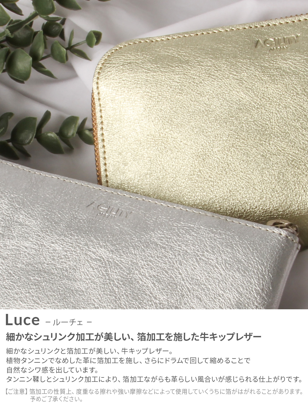 細かなシュリンク加工と箔の光沢が美しい、東京製の本革長財布。素材には、植物タンニンで鞣された牛キップレザーを使用し、革の表面に箔加工を施した後、大きなドラムで水と一緒に回すことで、自然なシボ感を生み出しました。箔加工レザーながら、しっかりと革らしい質感も感じられる仕上がりです。