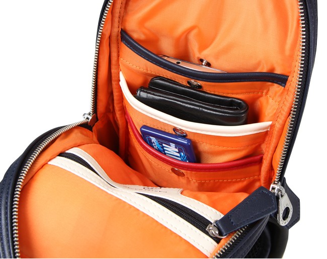 フロントトップにはコの字ファスナーポケットが装備。小物アイテムの収納に最適なサイズです。