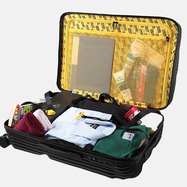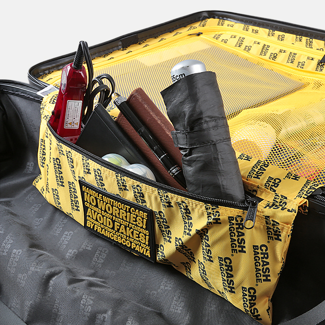 内装はクラッシュバゲージ(CRASH BAGGAGE)らしい派手なデザインですが、構造は至ってシンプル。ユーザビリティに特化した設計になっています。ケース蓋側はラウンドタイプの中仕切りで荷崩れをしっかり防止。ケース本体側はクロスベルトで荷崩れを防止しながらもある程度自由度の高い収納を可能にしました。