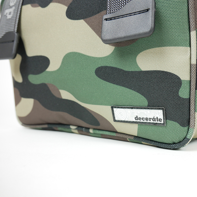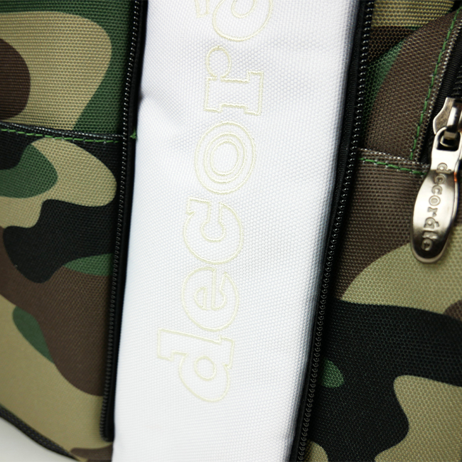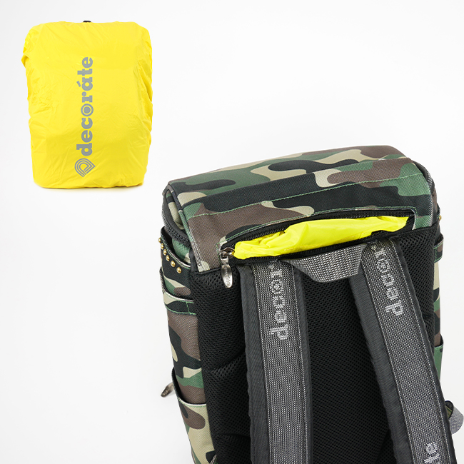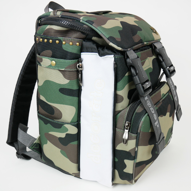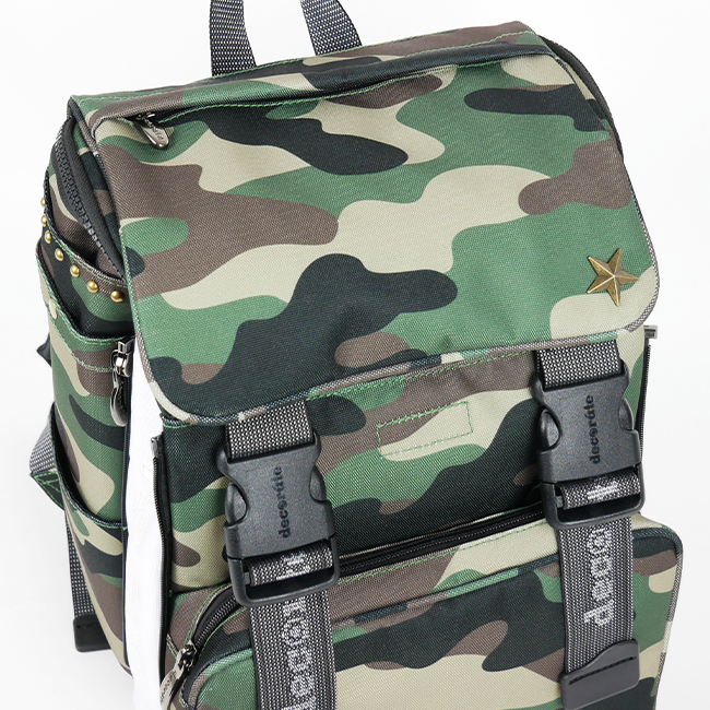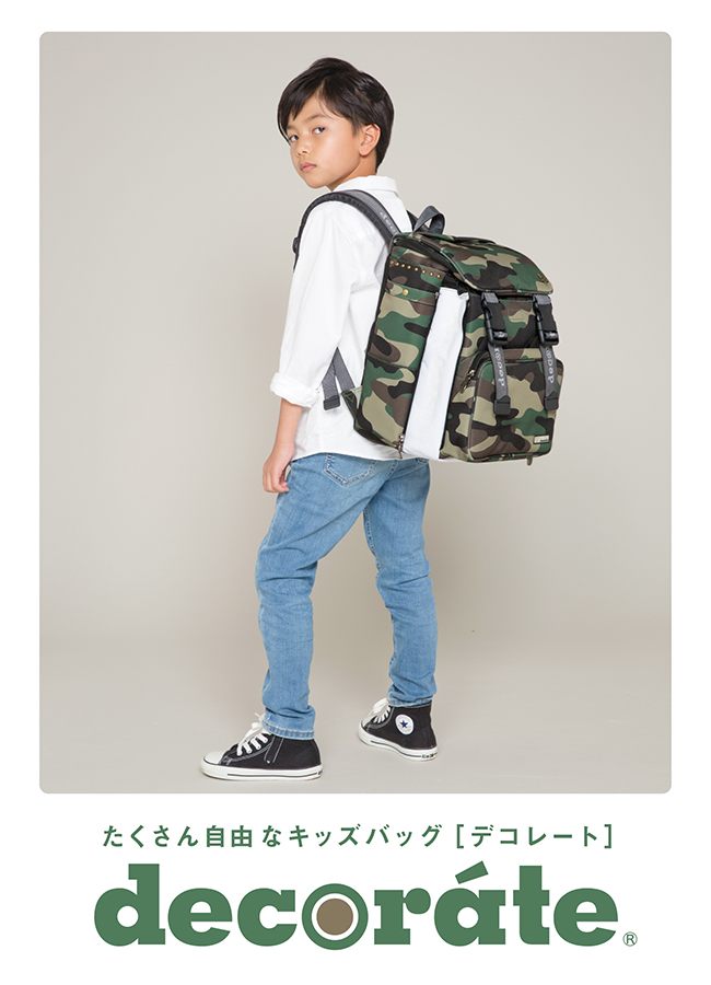 定番のウッドランドカモ柄ながら、ハードになり過ぎない色味にて作製したdecorateオリジナルのカモフラージュ柄。カブセ部分と左右のサイド上部に施されたスタッズがポイントです。男の子女の子を問わずお使いいただけるカモフラージュ柄は、お洋服との相性も気にせずお使いいただけます。
