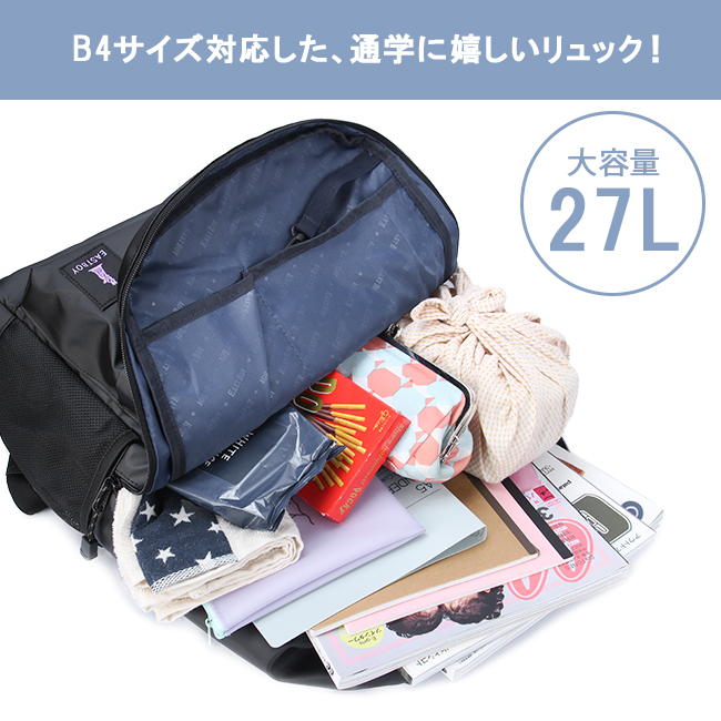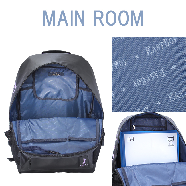 容量約27Lと大容量で部活や教科書など荷物の多い通学にピッタリです。メインルームには、A4サイズはもちろんB4サイズも対応。マチ幅もあるのでお弁当や分厚い参考書・部活の着替え等も収まります。
