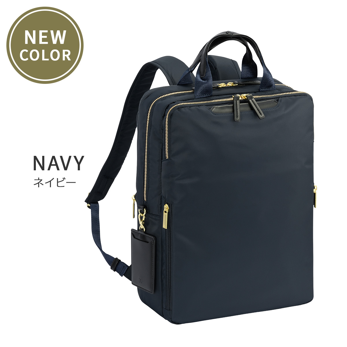 こちらは通勤に最適なスクエア型の、スリムで機能的なA4サイズ対応のビジネスリュック。エキスパンド機能付き。14.0インチノートPC、A4ファイルが入るサイズ感。電車内などで前持ちした際も邪魔になりにくい、スリムでコンパクトなシルエットに仕上げました。