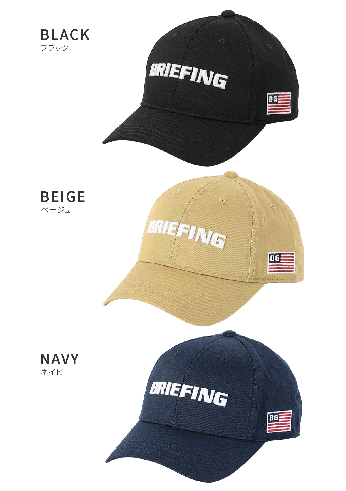 フロントには立体的なBRIEFINGロゴ刺繍を配置し、サイドには星条旗モチーフ、アジャスター部分にはBRIEFINGロゴの刺繍をあしらうことで、さりげないアクセントをプラスしています。