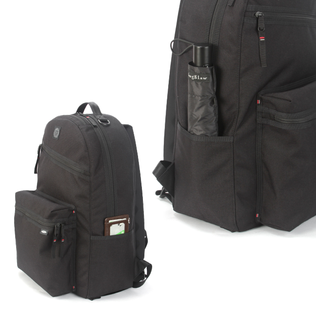 本体両サイドにはペットボトル、スマートフォン、折り畳み傘などが収納できるポケット。全面ポケット、メインポケットはダブルファスナーとなり、開閉が大きく、左右どちらからでも荷物の出し入れがしやすい作りとなります。
