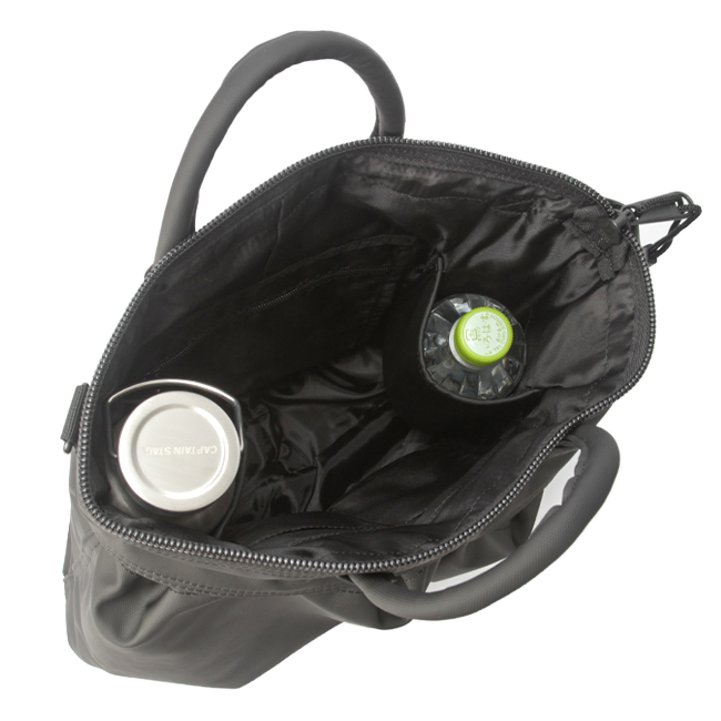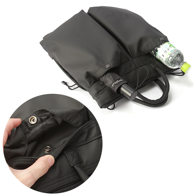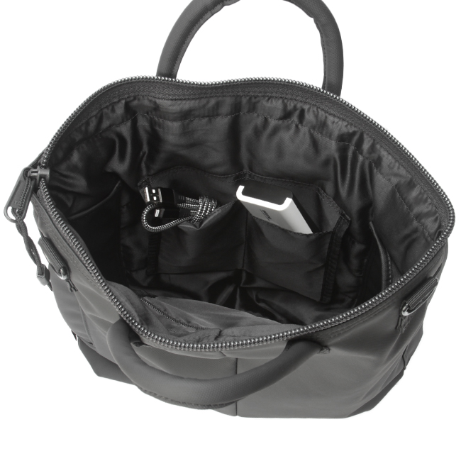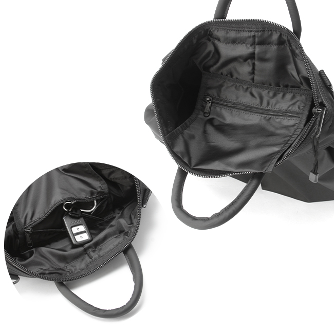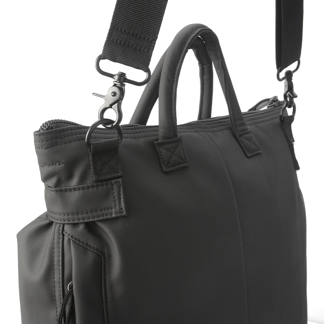 取り外しできるショルダーストラップ付きで、手持ち・肩掛け・斜め掛けの3WAYでご使用頂けます。メイン収納にはA4雑誌がすっぽりと入るので、ビジネスシーンでもプライベートシーンでも大活躍。内側サイドポケットは折り畳み傘や500mlのペットボトルを収納していただくのに便利です。また、背面ファスナーには長財布サイズも収納可能です。