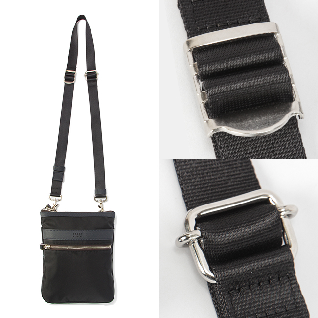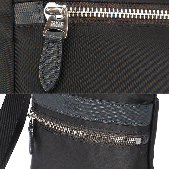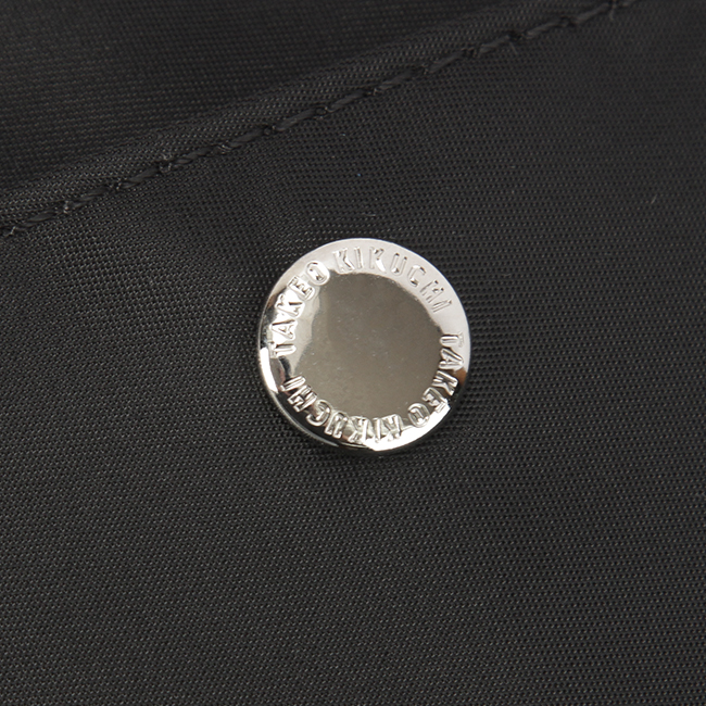 本体素材には上品な光沢感と発色の良さが特徴のナイロンツイルを使用し、付属革にはミニメッシュエンボスレザーを採用。付属革にマットブラック色でタケオキクチのブランドロゴが箔押しされております。