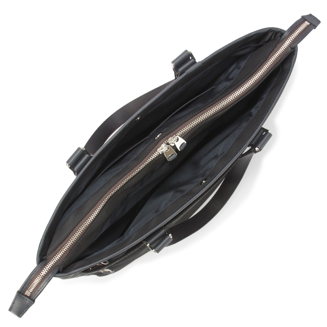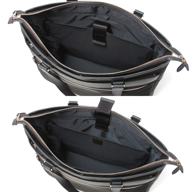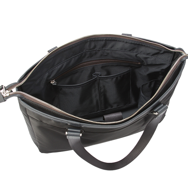アオリポケットが前面側と背面側にそれぞれついております。内装には小物ポケットやペン刺し、ペットボトルホルダーもあり、充実した収納となっております。緩衝材入りのポケットがあり、13インチまでのノートパソコンが入ります。