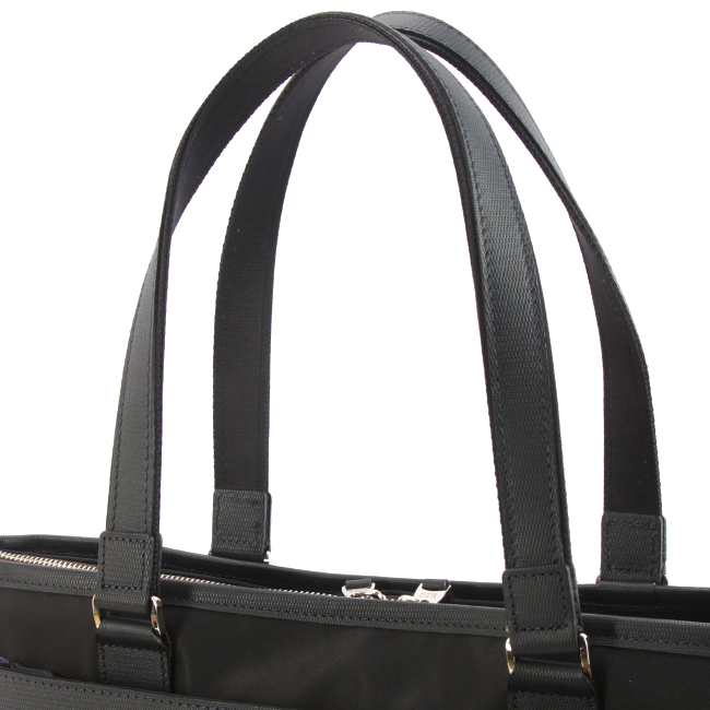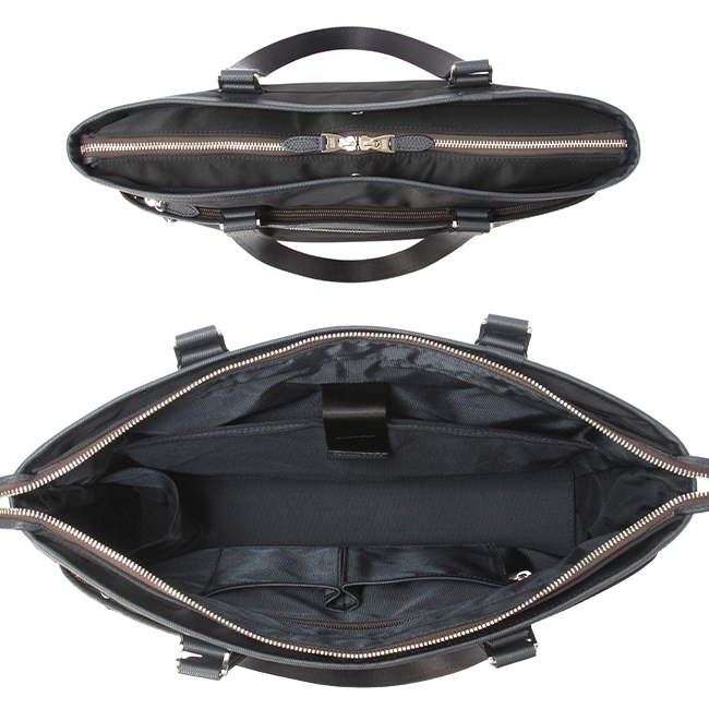本体素材には上品な光沢感と発色の良さが特徴のナイロンツイルを使用し、付属革にはミニメッシュエンボスレザーを採用。付属革にマットブラック色でタケオキクチのブランドロゴが箔押しされております。