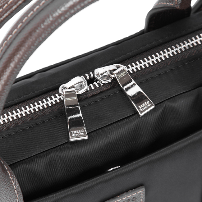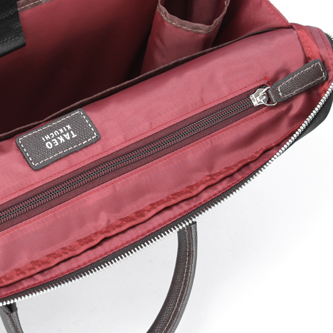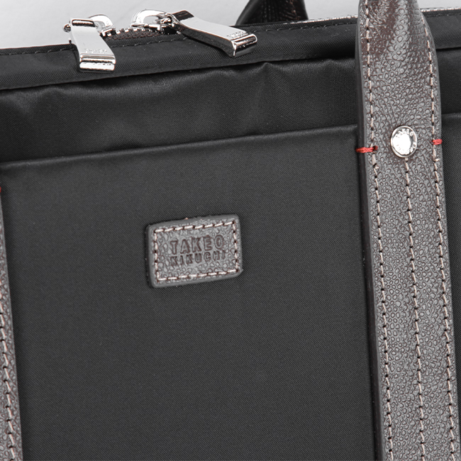 取っ手等のパーツには上品なイメージを与えつつ強度に優れた素材である、チェルケス調のエンボスレザーを使用。また、それぞれのパーツに丁寧にかがりステッチを施しています。革の質感やステッチのカラーはタケオキクチの他シリーズを意識したものを採用しており、タケオキクチらしさを演出するこだわりのパーツに仕上げました。