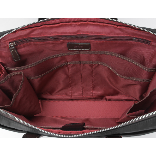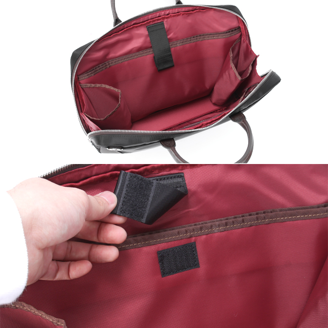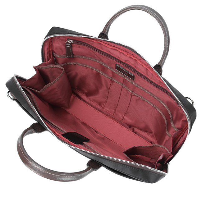 A4サイズのファイルが収納可能なビジネスバッグです。メインルームには仕切り付きクッションポケット、ファスナーポケット、オープンポケットが4つ、ペン差し2つを装備。仕切り付きクッションポケットは13.3インチのノートパソコンに対応しています(ポケットサイズ38x23cm)。また、需要の高いペットボトルホルダーと折りたたみ傘ホルダーが付いています。バッグ前面にはホック付きポケットがあり、さらにその中にオープンポケット2つを装備。ショルダーベルトが付属しているので、手持ちと肩掛けの2wayでご利用いただけます。
