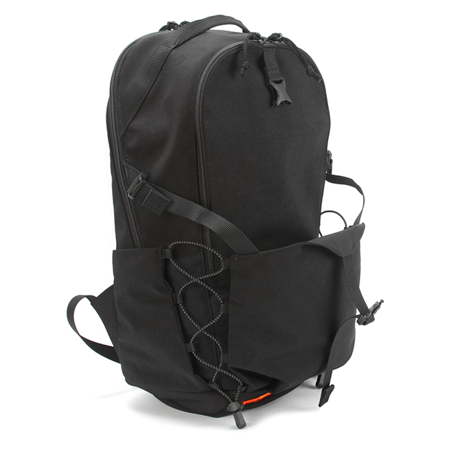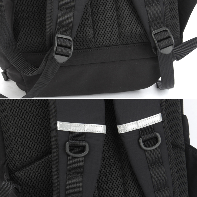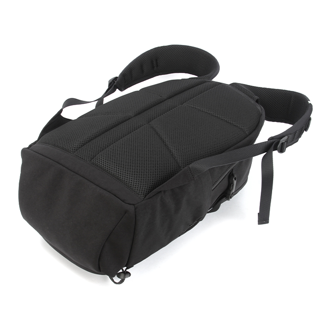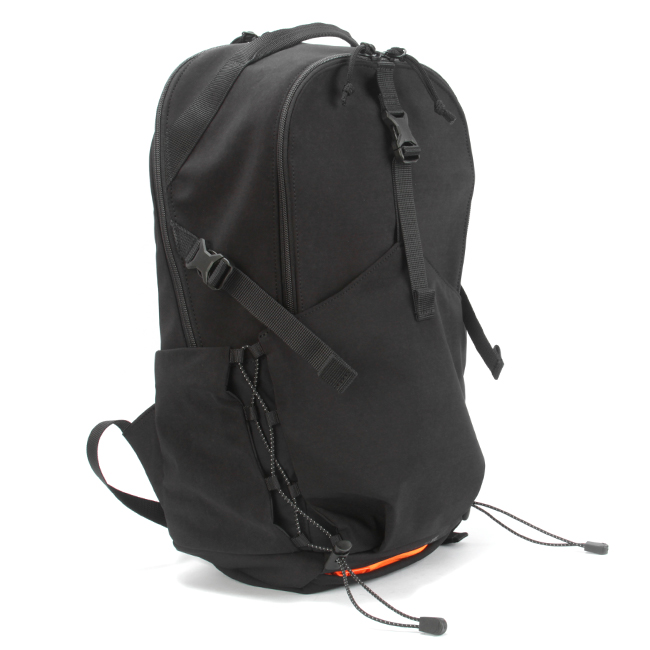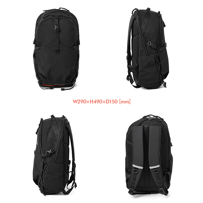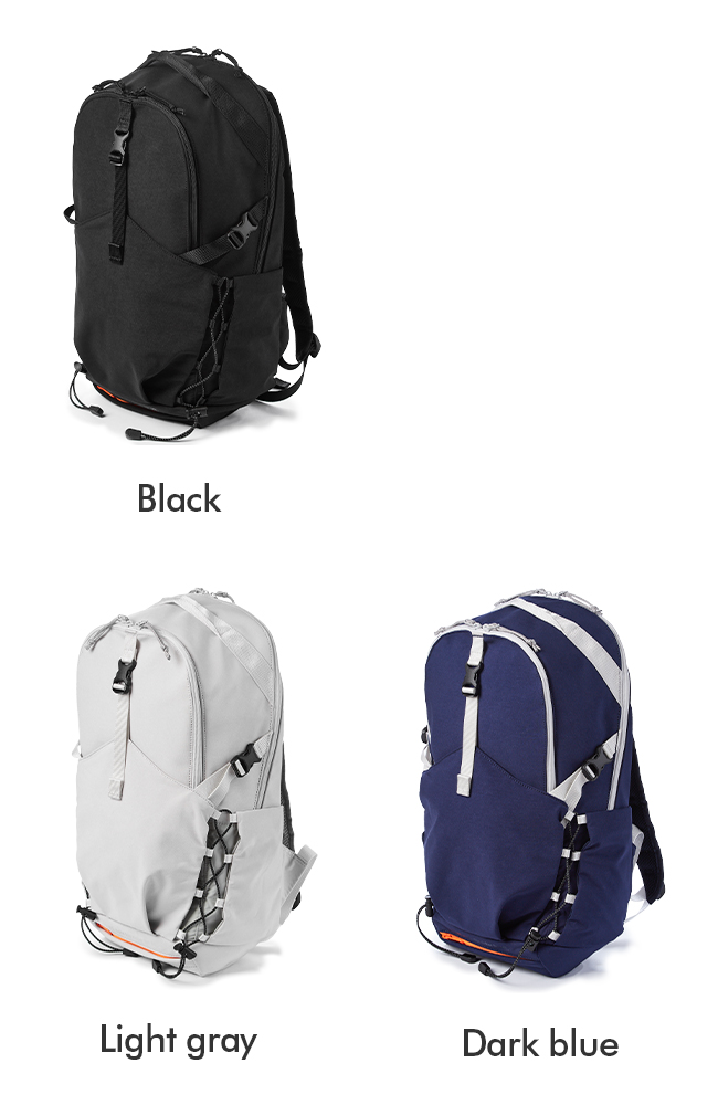 フロントのバックルやゴムコードがポイントのデイパック。フロントには前面ポケットがあり、バックルベルトやコードを調節しジャケットやヘルメットといった大物類も収納可能。また、内側は撥水生地のため、雨傘や水滴のついたペットボトルも収納できます。前胴のファスナーポケットには内装にポケットが1つ。メイン内装には13inchパソコンが収納できるPCポケットが1つあります。フロントのゴムコードと背負いには反射機能を搭載しており夜の視認性を高めます。ボトムポケットにはレインカバーを収納しており、雨天時にも対応しています。メインの素材はナイロンのジャージー編みに塩縮加工を施し、しっかりと目を詰めた手触りのよいオリジナル素材。織物とは違う優しいタッチ感が特徴です。