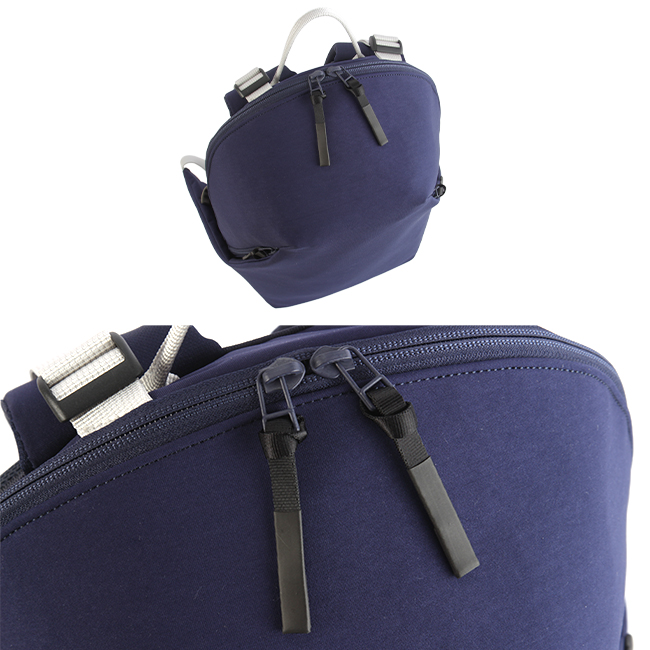 フロントの隠しファスナーポケットは、小物の収納に最適。肩掛けをする際に左右どちらからもアクセスしやすいシンメトリックなデザイン。本体側部の比翼部分を活かしたスリットポケットはボトルや折り畳み傘などすぐに取り出したいものを収納できます。内装には13inchのPCポケット。背負いにはチェストベルト・ショルダースタビライザー・取り外し可能なマグネットバックルキーホルダーがあり、バックルキーホルダーには鍵やICカードをぶら下げることができます。背負い右側にある樹脂フックにはイヤホンなどの固定が可能です。メインの素材はナイロンのジャージー編みに塩縮加工を施し、しっかりと目を詰めた手触りのよいオリジナル素材。織物とは違う優しいタッチ感が特徴です。