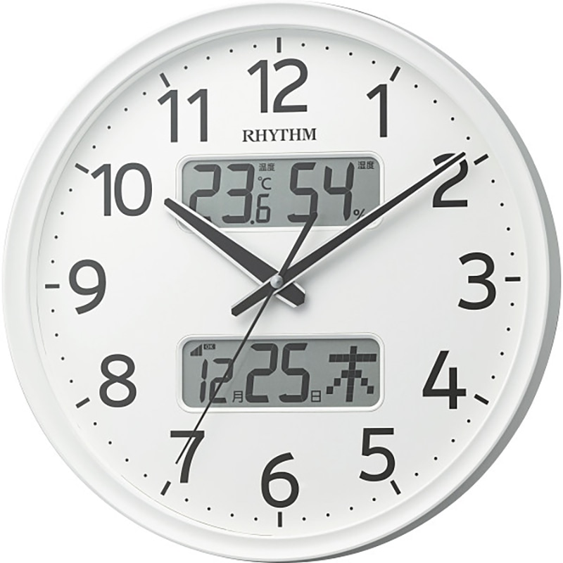 コチコチ音がしない連続秒針の液晶表示付電波掛時計です。大きな文字板で、時間も温湿度もカレンダーも見やすくなっています。
