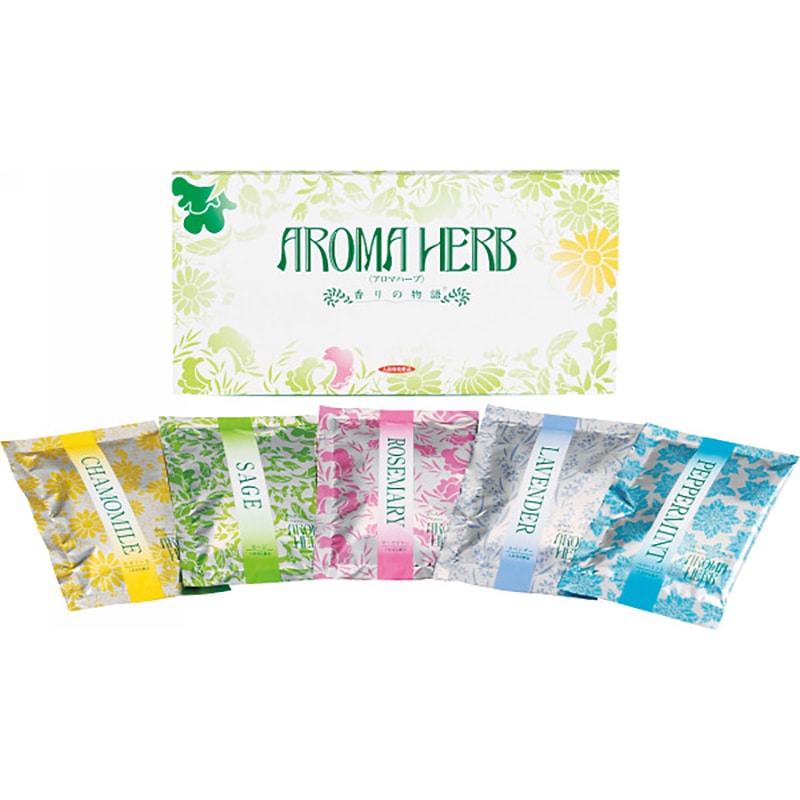 ・内容:ハーブエキス配合入浴料30g×5包(カモミール・セージ・ローズマリー・ラベンダー・ペパーミント×各1)
