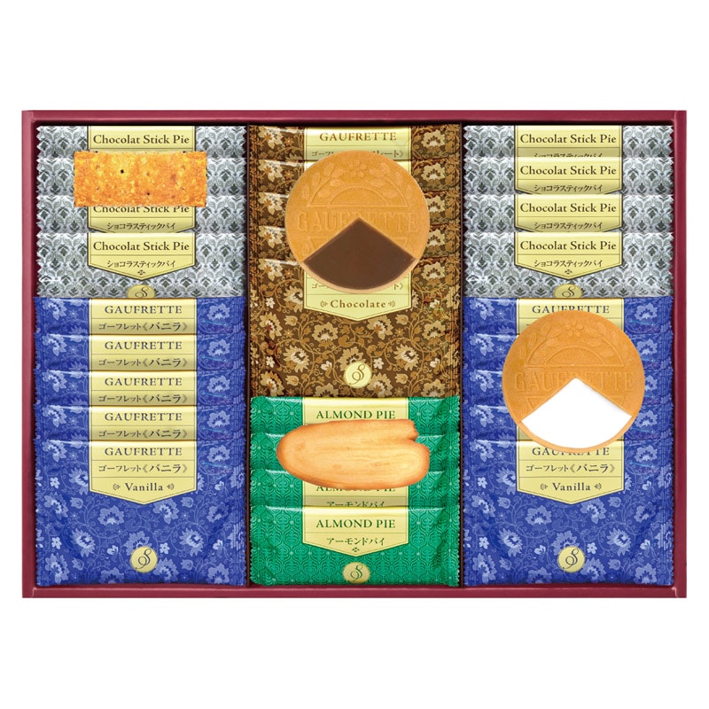 風味豊かなバニラクリームをサンドしたバニラゴーフレットや、上品な味わいに仕上げたチョコゴーフレット、何層にも重ねたパイ生地に細かく砕いたアーモンドを挟み、サックリと焼き上げたアーモンドパイ、チョコをサンドしたやさしい甘さのショコラスティックパイをセットしました。お菓子好きな人にも満足な詰合せです。