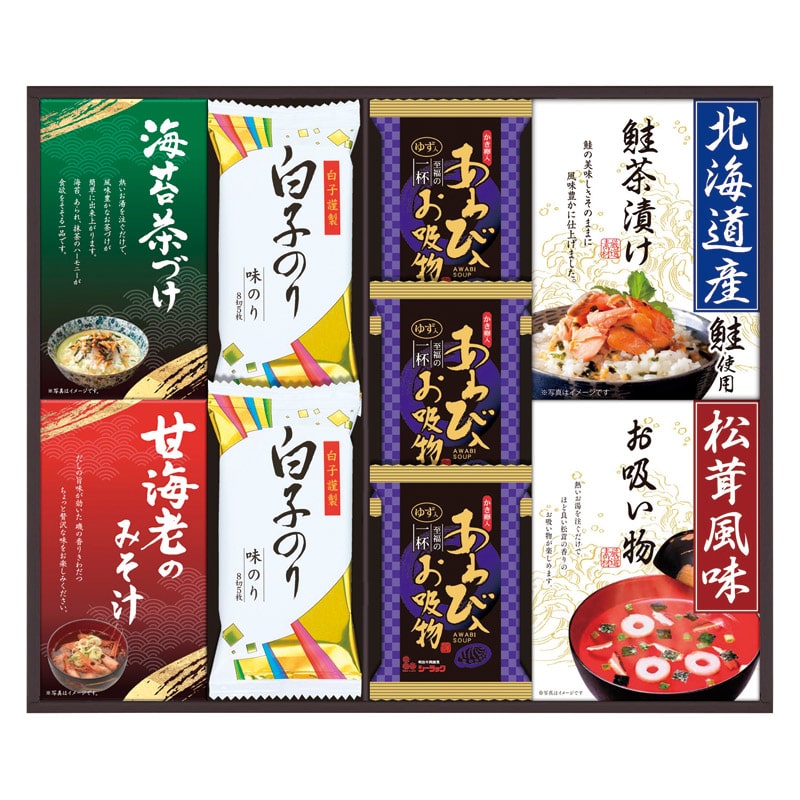 ・内容:セット内容/あわび入お吸い物(4g)×3、白子のり(8切5枚)×2、北海道産鮭茶漬け(4g×3袋)・永谷園松茸風味お吸い物(2.3g×4袋)・甘海老みそ汁(7.5g×2袋)・丸美屋のり茶漬け(6g×4袋)×各1