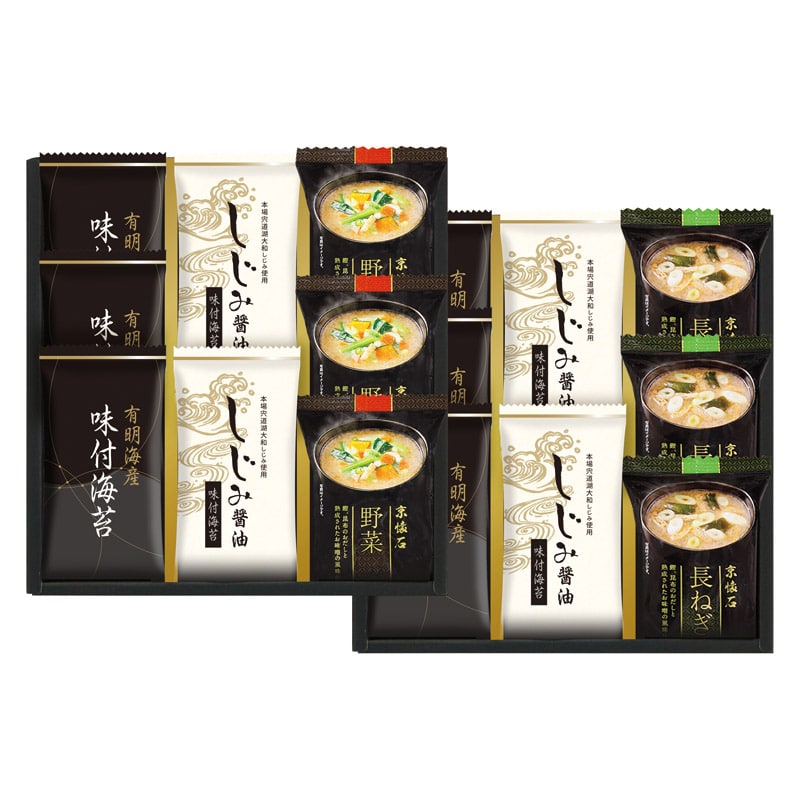 ・内容:セット内容/有明海産味付海苔(8切8枚)×6、しじみ醤油味付海苔(8切8枚)×4、マルコメ京懐石おみそ汁(野菜(17.4g)・長ねぎ(15.7g))×各3