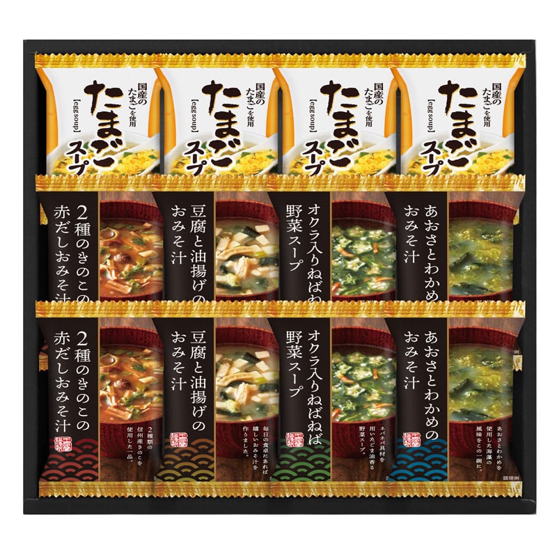 ・内容:セット内容/たまごスープ(6.4g)×4、豆腐と油揚げのおみそ汁・2種のきのこの赤だしおみそ汁・あおさとわかめのおみそ汁・オクラ入ねばねば野菜スープ×各2