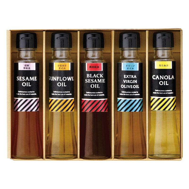 ・内容:セット内容/胡麻香味油・ひまわり油・黒胡麻油・EXVオリーブオイル・なたね油(各90g)×各1