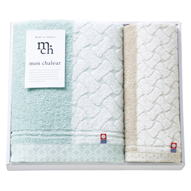 今治ならではのやわらかなやさしいタオル。『あたたかな』を意味するフランス語と『世界』を意味するから名づけられた『MonChaleur』。縦に2つの色を配し、右側の縄の網目のような模様が特徴です。