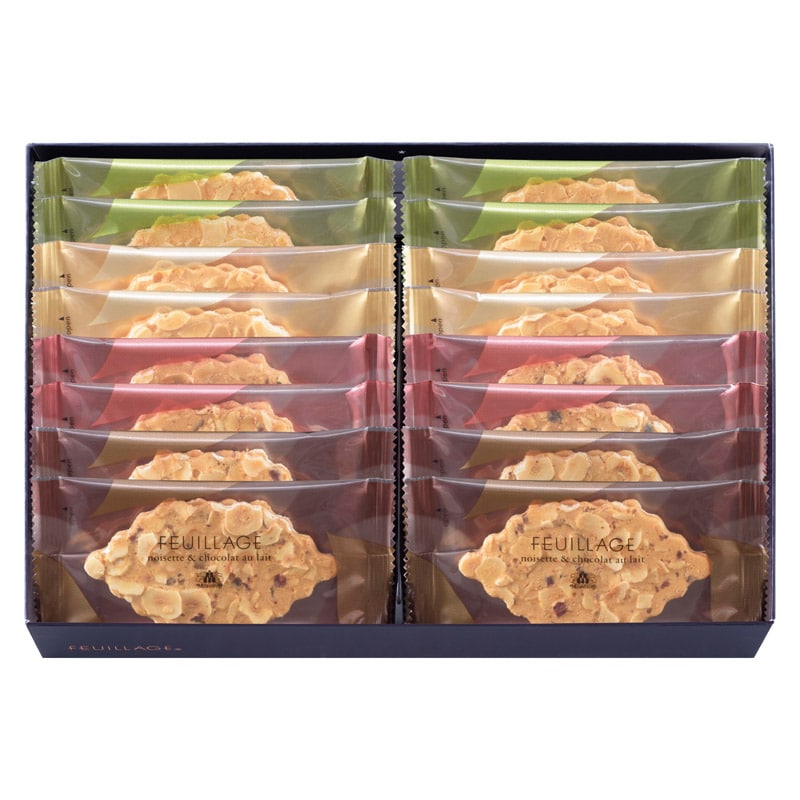 フランス語で「木の葉」を意味するクッキー。スライスナッツをしきつめてパリッと香ばしく焼き上げたクッキーにバランスよくチョコレートをサンドしました。チョコレートはナッツに合わせて相性のよいものを厳選。クッキーとナッツとチョコレート、それぞれの味と食感が繊細に重なり合います。