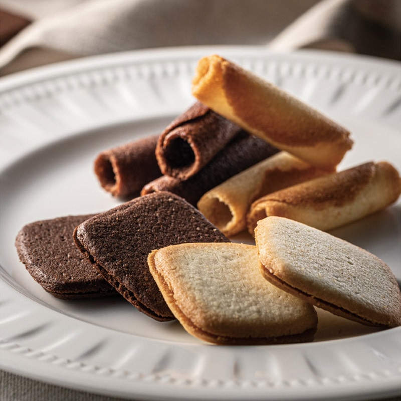 薄く軽やかな食感のラングドシャにチョコレートを合わせました。さっくりとしたバニラクッキーに、上品な甘さのミルクチョコレート、カカオ香るチョコレートクッキーに、ミルキーなホワイトチョコレート、2種類の味が楽しめます。オデット姫のイラストが愛らしいパッケージデザインも人気です。
