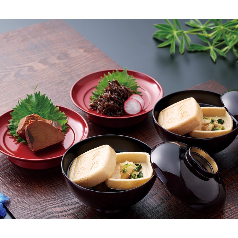 ・内容:お吸物(帆立・ふぐ・おすまし)×各2、かつお角煮(70g)・黒豚しぐれ煮・きくらげ佃煮(各60g)・ちりめん山椒(50g)×各1