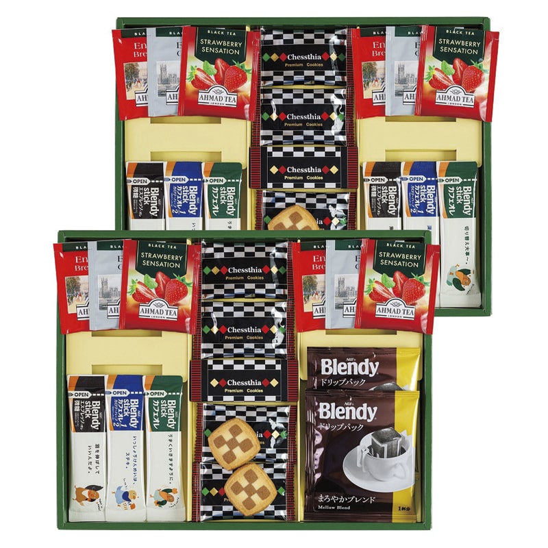 ・内容:チェスティアクッキー×8、AGFブレンディコーヒードリップ式7g×2、紅茶(アールグレイ・イングリッシュブレックファースト・ストロベリー)2g×各4、AGFブレンディスティック(エスプレッソ・オレ5.8g・カフェオレカロリーハーフ5.4g・カフェオレ8.2g)×各3