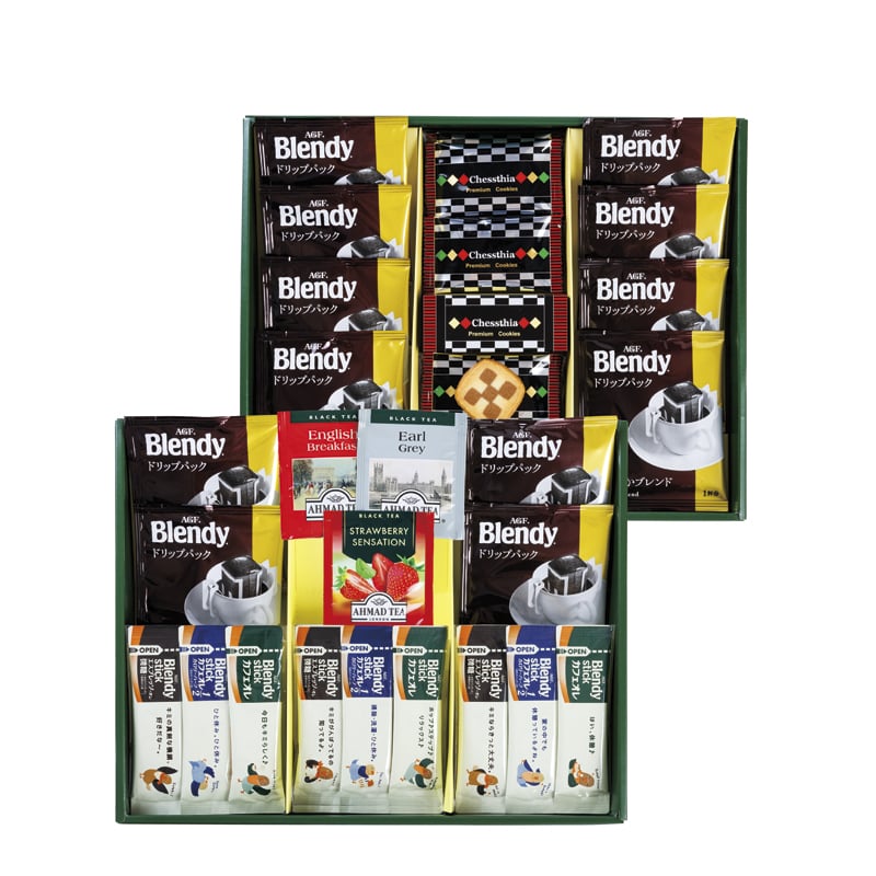・内容:チェスティアクッキー・AGFブレンディコーヒードリップ式7g×各12、紅茶(アールグレイ・イングリッシュブレックファースト・ストロベリー)2g×各1、AGFブレンディスティック(エスプレッソオレ5.8g・カフェオレハーフ5.4g・カフェオレ8.2g)×各3