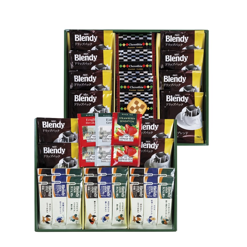 ・内容:チェスティアクッキー×15、AGFブレンディコーヒードリップ式7g×12、紅茶(アールグレイ・イングリッシュブレックファースト・ストロベリー)2g×各2、AGFブレンディスティック(エスプレッソオレ5.8g・カフェオレハーフ5.4g・カフェオレ8.2g)×各6