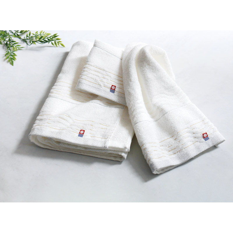 お肌になじみ、水分をしっかり吸収してくれるのでとても使いやすく贈り物に最適です。金糸・銀糸を使うことでさりげない豪華さと気品をそなえています。タオルの名産地「今治」から純白のタオルに気品をのせて。