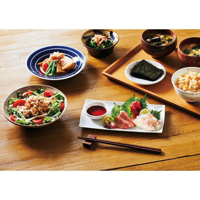 食べきりタイプの個包装が便利な大森屋の味付のり、お湯を注ぐだけで簡単に作り立てのおいしさが味わえるアマノフーズのフリーズドライおみそ汁など食卓にあると嬉しいギフトセットです。