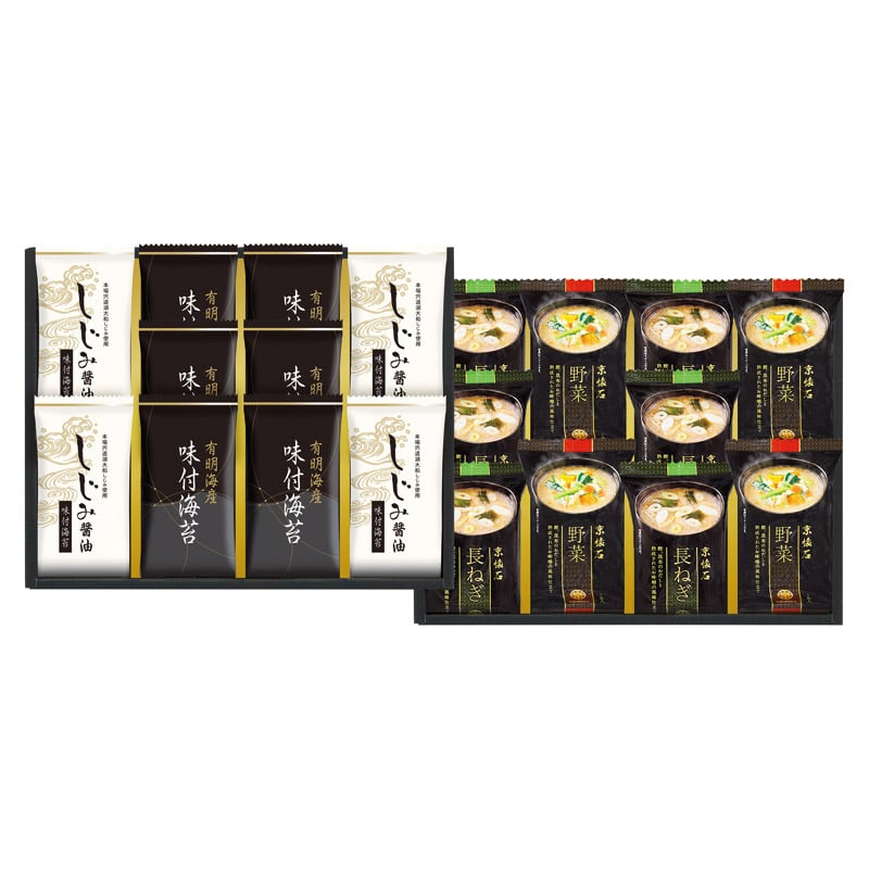 ・内容:有明海産味付海苔(8切8枚)・マルコメ京懐石長ねぎのおみそ汁(15.7g)×各6、しじみ醤油味付海苔(8切8枚)・マルコメ京懐石野菜のおみそ汁(17.4g)×各4