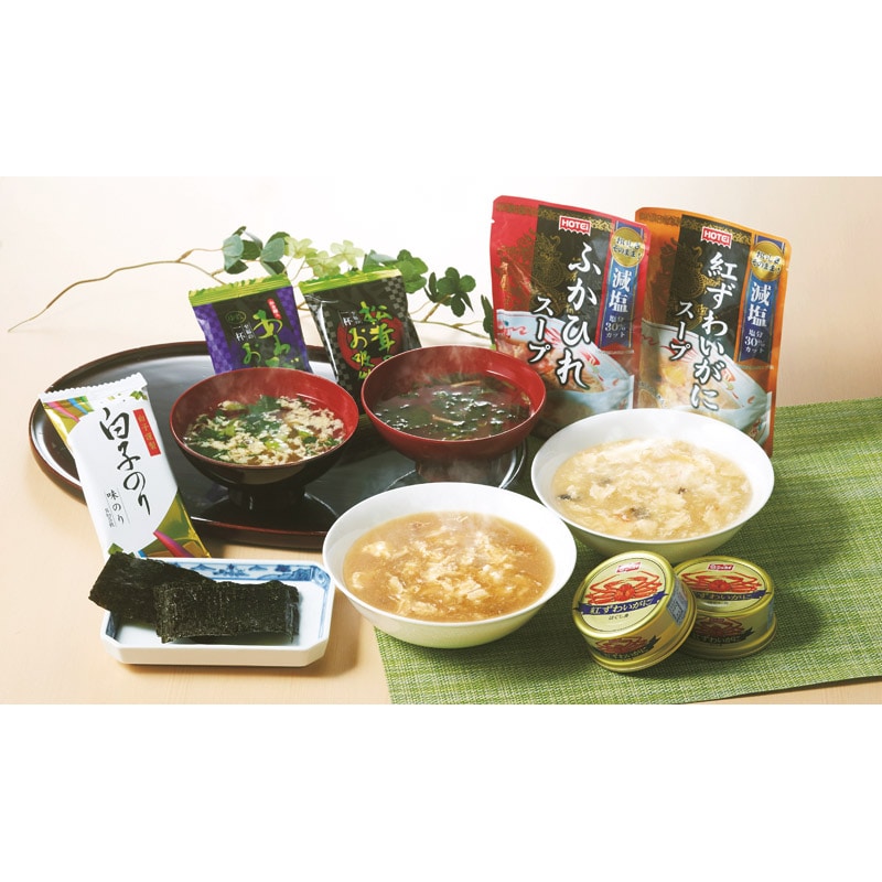 ・内容:松茸入りお吸い物(4.2g)・白子のり(8切5枚)×各2、ふかひれスープ(160g)・あわび入お吸い物4g・丸美屋のり茶漬け(6g×2)×各1