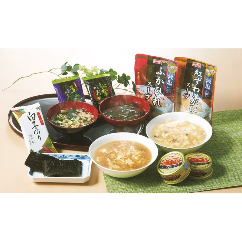 ・内容:白子のり(8切5枚)×4、あわび入お吸い物(4g)×2、ふかひれスープ(160g)・松茸入りお吸い物(4.2g)・丸美屋のり茶漬け(6g×2)×各1