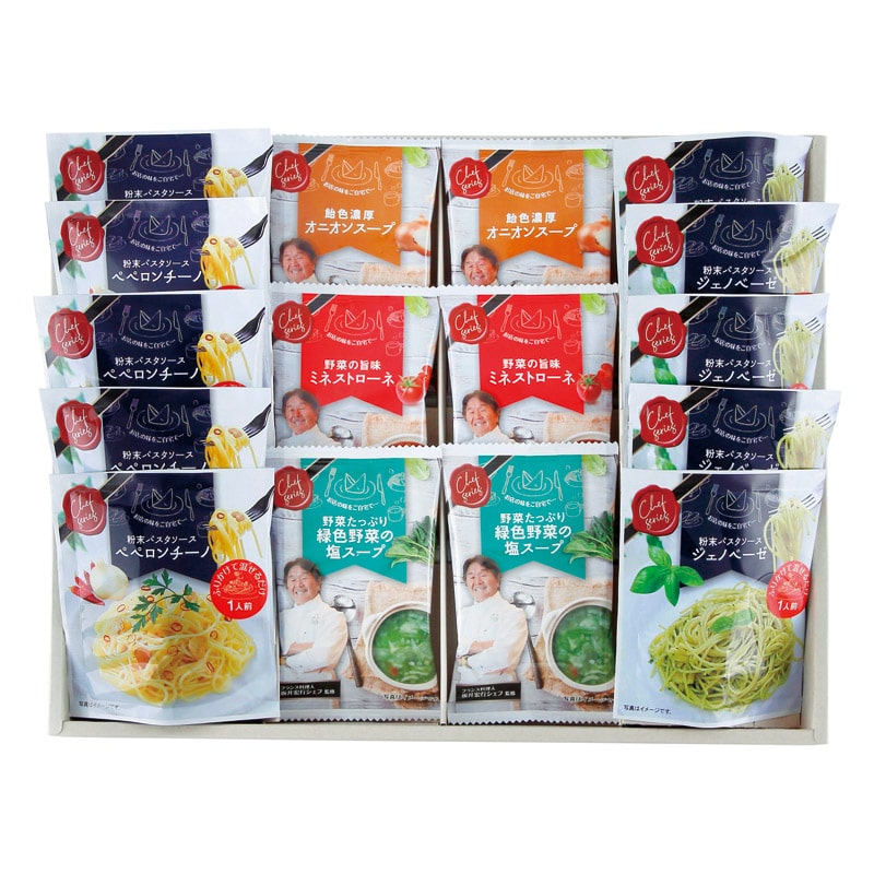 ・内容:ジェノベーゼ粉末パスタソース・ペペロンチーノ粉末パスタソース×各5、オニオンスープ・ミネストローネ・緑色野菜の塩スープ×各2