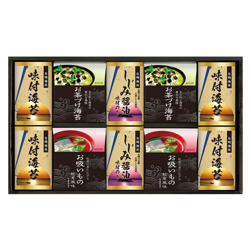 ・内容:有明海産味付海苔(10切20枚)×4、永谷園お茶づけ海苔(4.7g×5袋)・永谷園お吸いもの松茸風味(2.3g×6袋)・しじみ醤油味付海苔(10切20枚)×各2