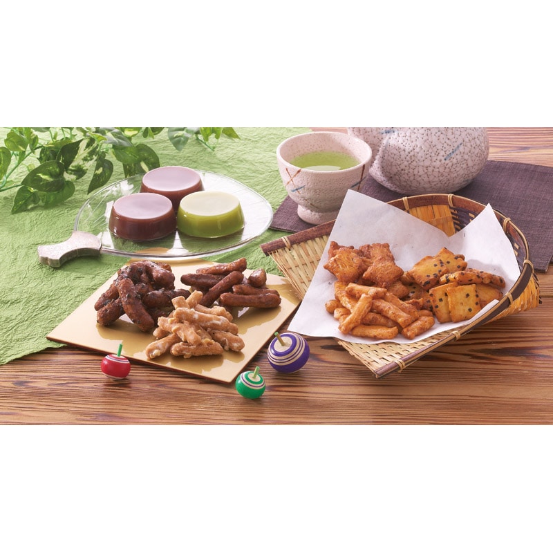 昔ながらの素朴な味のかりんとう、国産米だけで作ったあられを詰合せました。
