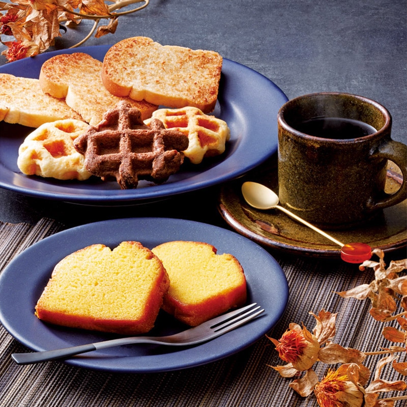ドトールコーヒーと、甘さを抑えたシュガーラスク、さくっとした軽い食感のココナッツラスクに、ベルギー産の粒状砂糖「パールシュガー」を加え食感にアクセントをつけた、程よい甘さのプレーンワッフル、やわらかな生地にカリカリとした食感がアクセントのチョコワッフル、レモンの香りが活きるアーモンド風味のレモンケーキのセットです。