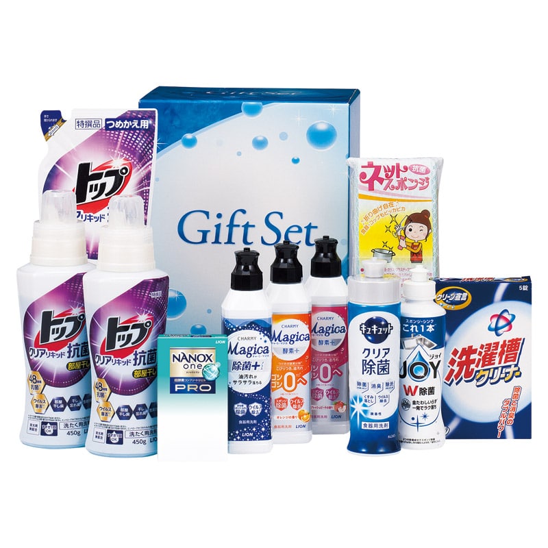 ・内容:ライオントップクリアリキッド抗菌(本体)(450g)×2、ライオントップクリアリキッド抗菌(つめかえ用)(350g)・P&G除菌ジョイコンパクト(170ml)・ライオンCHARMYMagica除菌+・ライオンCHARMYMagica酵素+オレンジの香り・ライオンCHARMYMagica酵素+フレッシュピーチの香り・花王キュキュット(クリア除菌)(各220ml)・ライオンNANOXonePRO(10g×2袋)・洗濯槽クリーナー5錠箱入・ネットスポンジ1P×各1